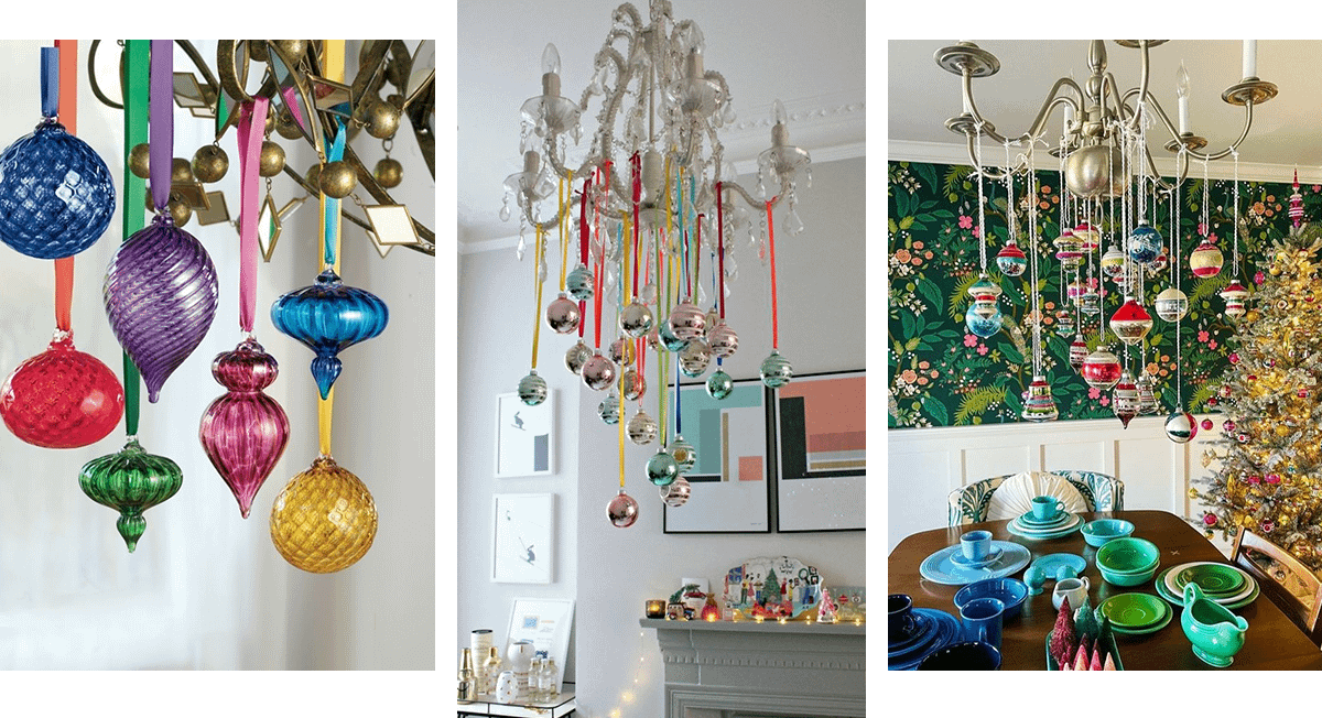 Если в твоем доме есть красивые люстры, укрась их к Новому году. Купи несколько цветных лент и яркие елочные игрушки. Разрежь ленты так, чтобы они были примерно одной длины, и просунь в них игрушки. Завяжи узелки и аккуратно повесь украшения на люстру. Идеально, если она висит над столом.