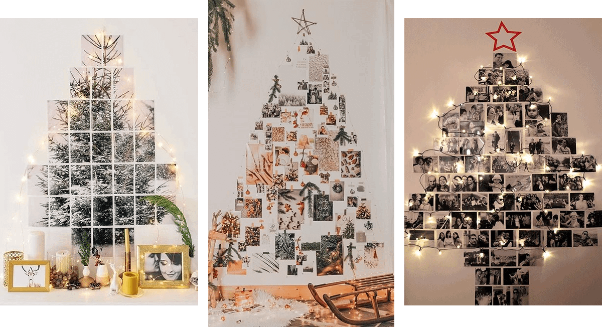 Можешь найти классные изображения в интернете или сделать фотографии самой. Сфотографируй, как выпекаешь печенье и развешиваешь гирлянду, нарисуй еловые ветки и шишки. Используй двусторонний скотч или прозрачную леску, чтобы закрепить изображения на стене. Размести их так, чтобы повторить форму елки.