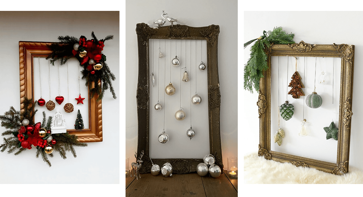 Готова потратить время и силы на создание необычного новогоднего декора? Тогда отправься в магазин для творчества и купи стильную большую рамку для картины. Лучше всего подойдут золотистые, украшенные объемными узорами. Подвесь игрушки на ленты или цветные нитки и закрепи их на задней части рамки так, чтобы получилась объемная картина.