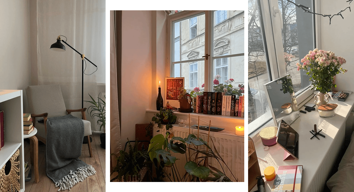 Даже небольшой «тихий уголок» для чтения, кресло у окна или рабочее место с аккуратной полкой создают чувство уюта. Также можешь небрежно кинуть на диван мягкий плед, разместить на столе несколько книг или журналов с яркими обложками.
