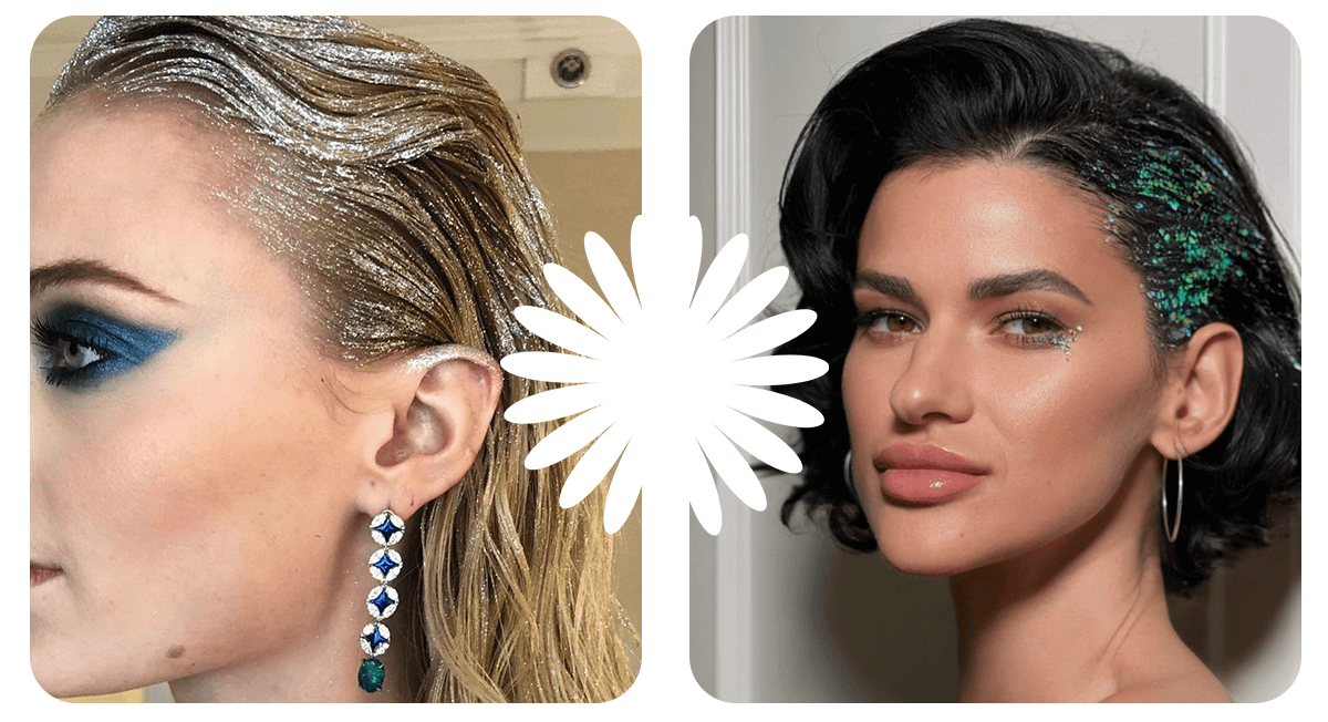 Глиттеры для волос есть в разных форматах: спреи, стики, гели. Используй их, чтобы сделать классическую укладку с волнами более эффектной. Если у тебя короткие волосы, распредели блестки с одной стороны — за ухом. Если ты обладательница длинных локонов, можешь нанести глиттер на всю длину.