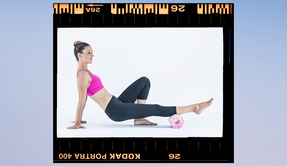 - Подложи под одну ногу ролл так, чтобы он оказался на середине икроножной мышцы;