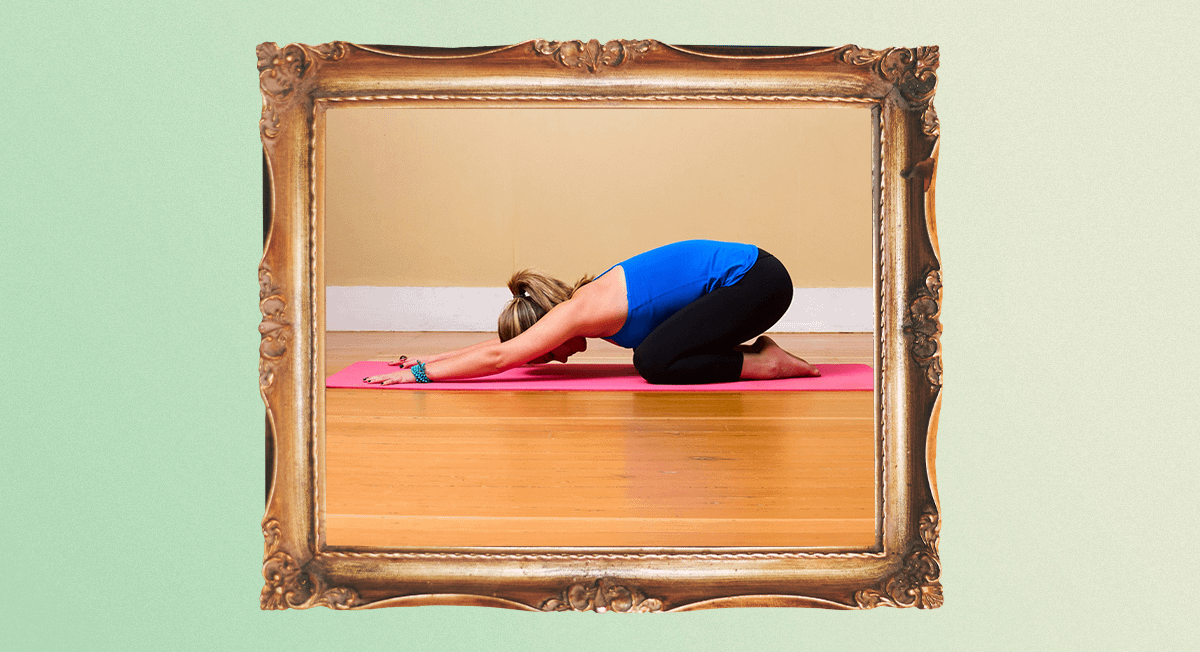 Это вариация классической «позы ребенка», которая дополнительно растягивает мышцы рук.