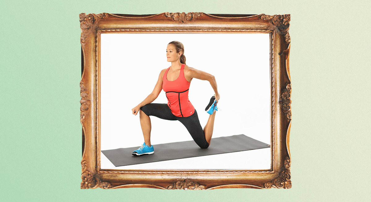 Встань на колени, расставив их на ширину бедер. Одну ногу выставь вперед, согнув под прямым углом, другую согни и подтяни стопу к ягодице рукой. Одновременно подавай таз чуть вперед — это усилит растяжку передней поверхности бедра и сгибателей.