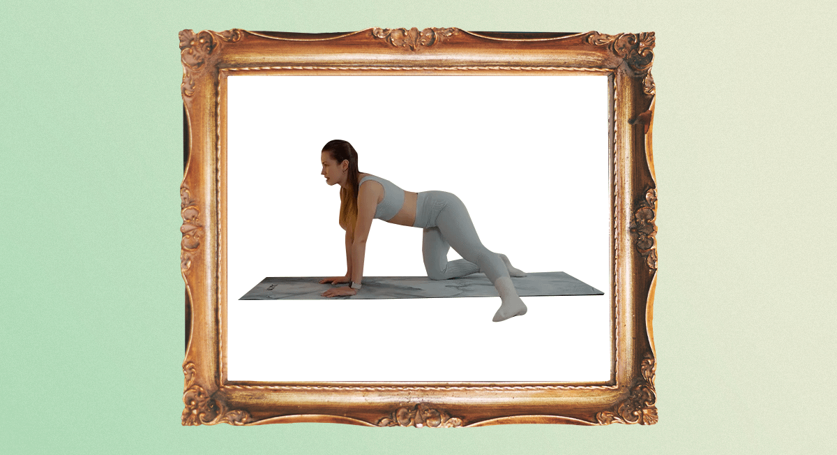 Начни с положения «стол» на четвереньках. Одну ногу вытяни назад, а вторую согни и выведи вперед, располагая ее так, чтобы голень образовала треугольник под корпусом. Задняя нога должна быть вытянута прямо.