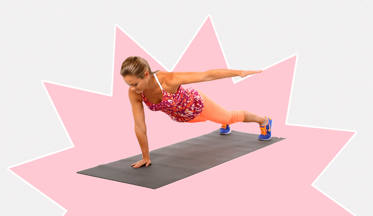 Еще один вариант упражнения для тех, кто давно занимается фитнесом. В планке старайся сохранять ровное дыхание.
