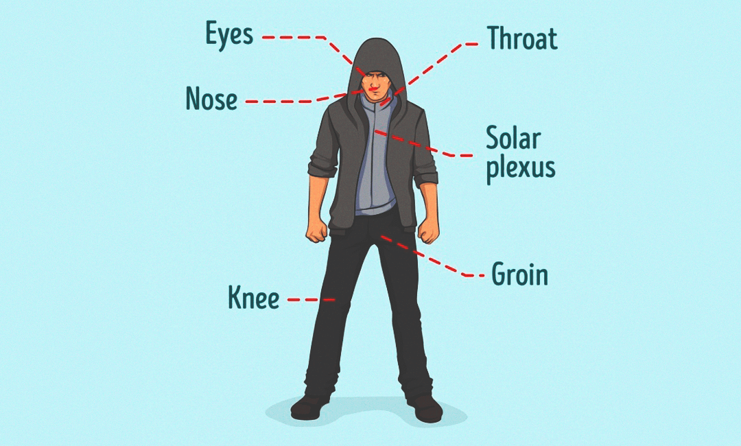 Отличный способ отбиться от нападения, не используя много силы, – бить в заднюю часть колена, пах, уши, глаза, нос и горло. Удары по этим базовым точкам причинят больше всего боли нападающему.
