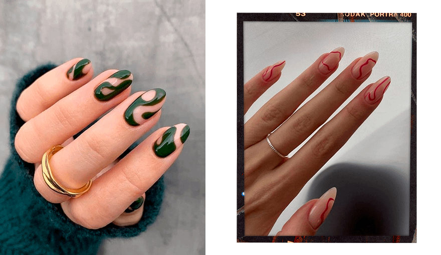 Маникюр с волнистыми линиями хорошо выглядит на ногтях овальной формы. Если предпочитаешь квадратную, попроси мастера сделать линии более тонкими и графичными.
