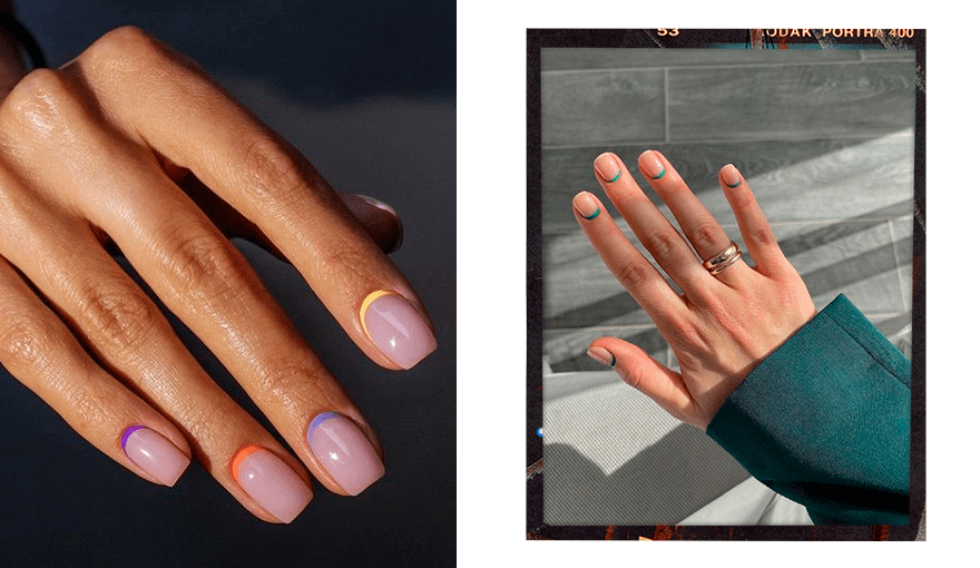 Этой весной нам предлагают попробовать обратный французский маникюр. Лунки могут быть прорисованы тонкой белой линией или заполнены лаком в ярком оттенке.
