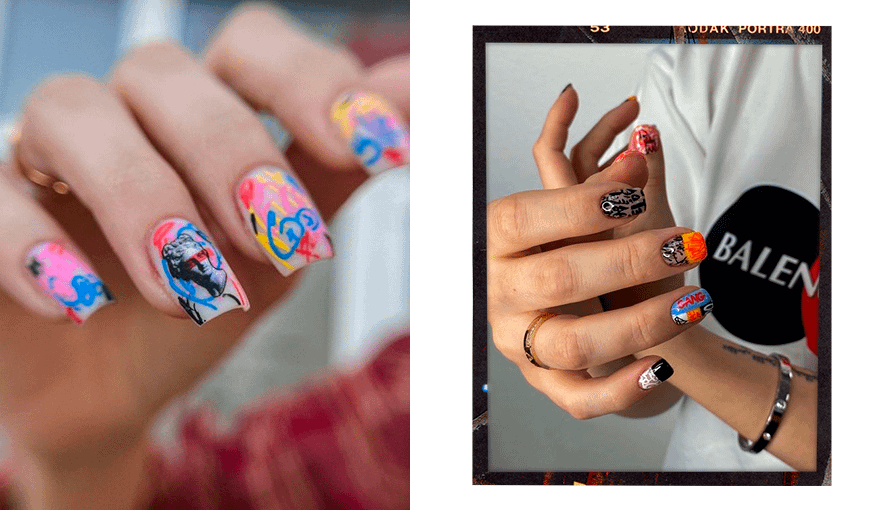 Если ты не из тех, кто предпочитает однотонный маникюр, обрати внимание на еще один тренд — дизайн с граффити. Он сделает образ более стильным и придаст ему особое настроение.