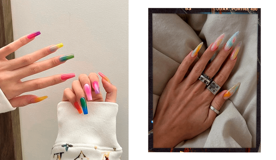 Обрати внимание на аэрографные дизайны в ярких весенних оттенках: желтом, голубом, розовом. Лучше всего необычное напыление выглядит на длинных ногтях.