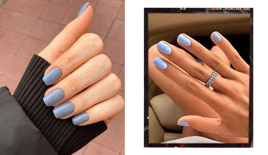 Голубой лак лучше всего выглядит на коротких ногтях. Но если не готова прощаться с длиной, попроси мастера придать ногтям квадратную форму.