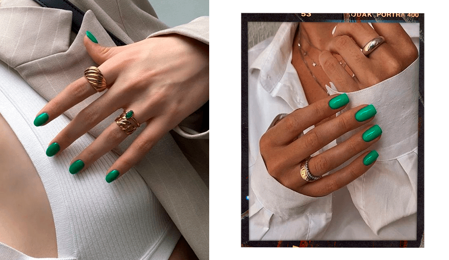 Если предпочитаешь классический стиль, откажись от длинных ногтей в пользу коротких квадратной формы. Дополни лук массивными украшениями, например, кольцами, браслетами, чтобы сделать образ более эффектным и ярким.