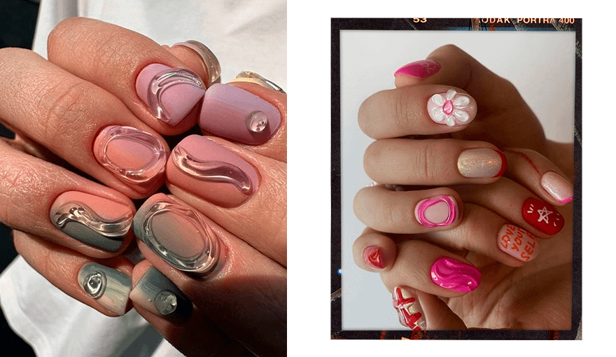 Такой дизайн маникюра подойдет девушкам, которые любят необычные решения. Объемные детали могут быть как абстрактными (изогнутые линии, замысловатые узоры), так и классическими: круги, сердечки, капли.