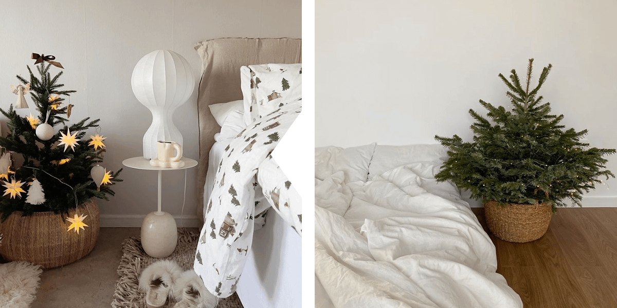 Здорово, если ты каждый год наряжаешь елку в гостиной. Но это не повод отказываться от возможности декорировать спальню. Если она у тебя небольшая, ограничься маленькой, но пышной елочкой. Укрась ее минималистично: достаточно повесить гирлянды или несколько милых игрушек. В качестве подставки используй плетеную корзину.