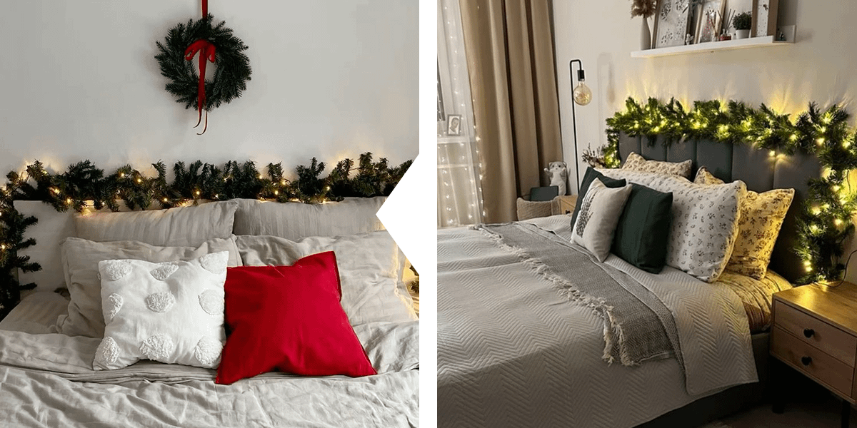 Это один из самых простых способов сделать спальню более уютной и придать ей особое новогоднее настроение. Выбери гирлянды с желтым светом: они более эстетичные и создают ощущение тепла. Чтобы чуть усложнить композицию, добавь к гирляндам мишуру в виде еловой ветки.