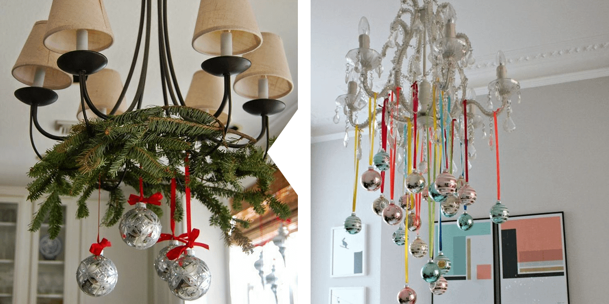 Если в твоей спальне висит кованая люстра, не упусти возможность преобразить ее к Новому году. Для этого используй еловые ветки и красные банты из ленточек либо разноцветные елочные шары. Подвесь их на прозрачных или цветных нитках так, чтобы они свисали на разной длине.