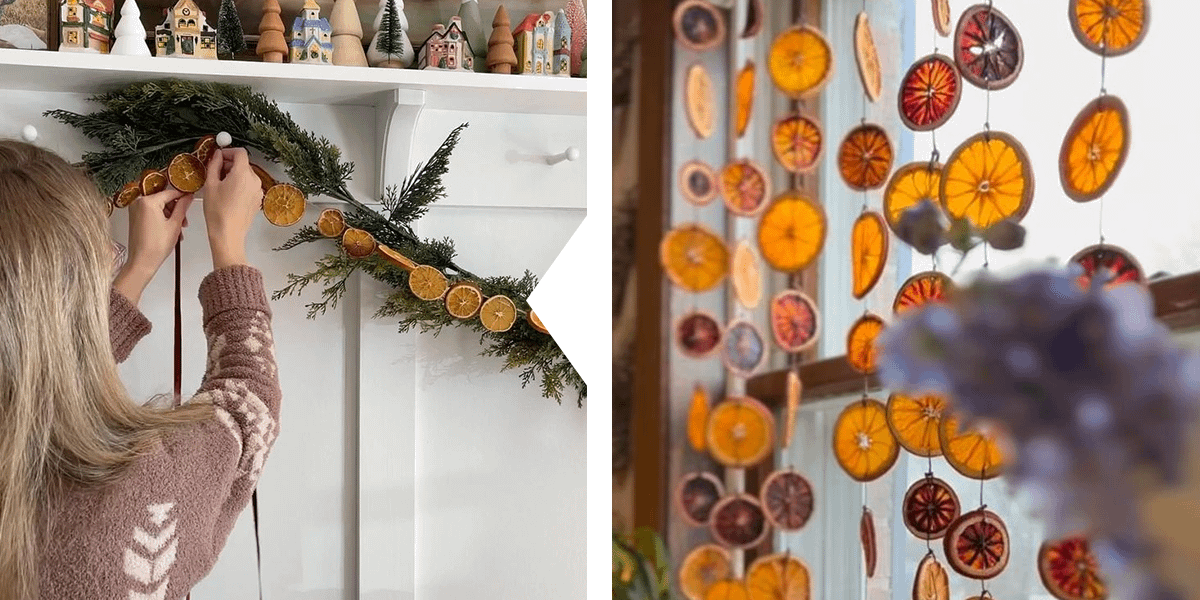 Тонко нарежь пару апельсинов и грейпфрутов. Высуши их в духовке и повесь на бечевку, чтобы получилась гирлянда. При желании дополнительно укрась ее палочками корицы или бадьяном. Повесь украшение у окна. Комната сразу же преобразится и наполнится приятными ароматами.