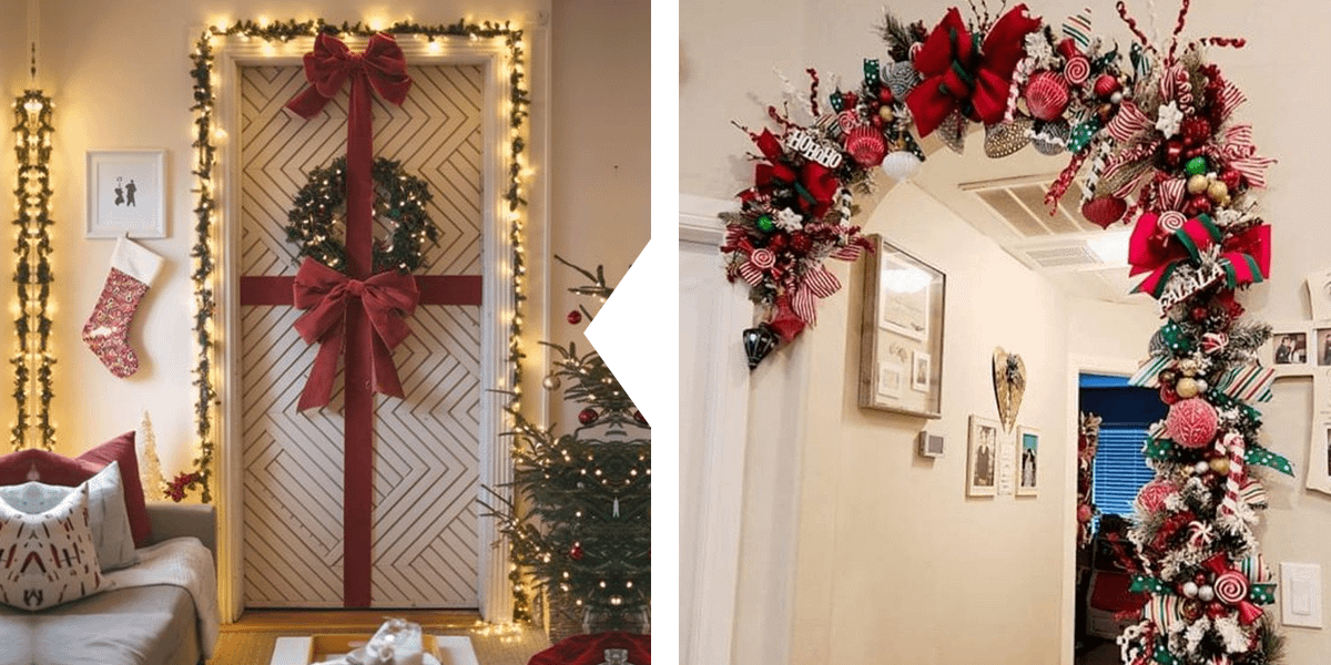 Вооружись длинной гирляндой, мишурой в виде еловой ветки, атласными бантами и елочными игрушками. Составь композицию и закрепи ее у дверного проема, используя специальные невидимые крепежи. Убедись, что декор не мешает открывать и закрывать дверь.