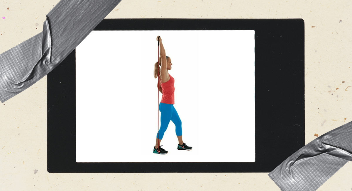 • закрепи резинку над головой, возьмись за ее концы и встань на нее ногами, создав натяжение;