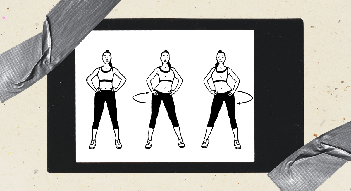 • медленно вращай корпус и талию по большой амплитуде влево, будто крутишь невидимый обруч;