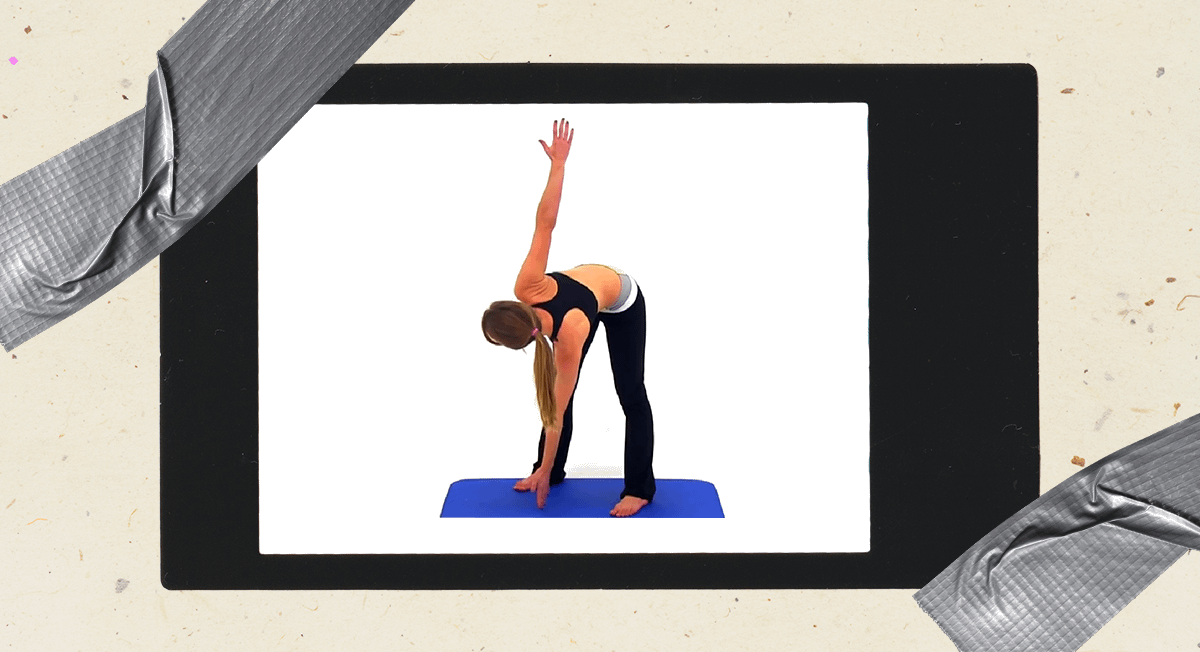 • наклонись вперед, скручивая корпус, и постарайся левой рукой коснуться правой стопы;