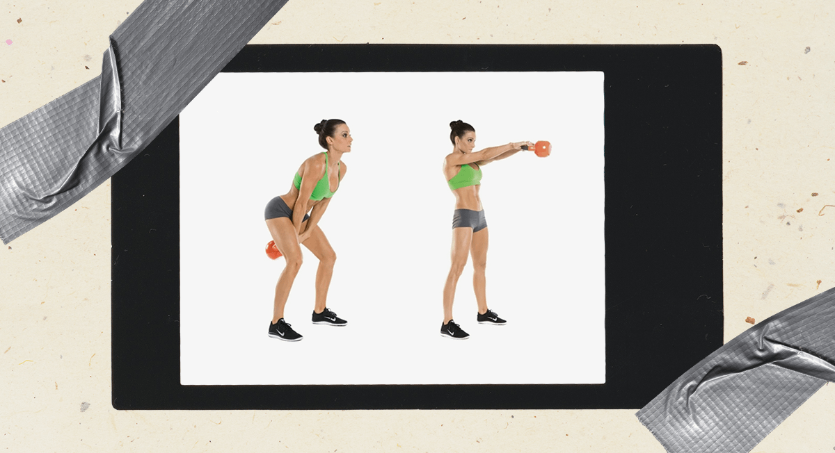 • возьми гирю двумя руками, выполни замах между ног и за счет мощного толчка бедрами выведи ее вперед до уровня груди;