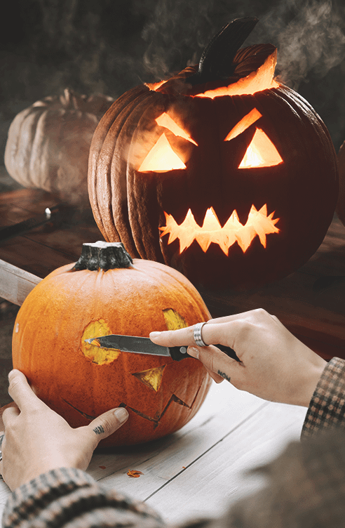 В этом варианте тыквы нож не понадобится, а трафарет пригодится. Выбрать можно любой тематический рисунок.