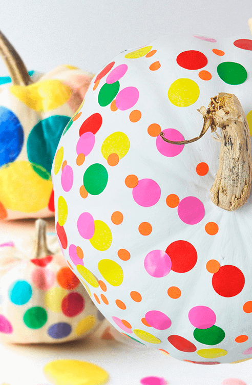 Очень простой способ «нарядить» тыкву на Хелоуин – нарисовать на ней разноцветные конфетти. Рекомендуем традиционные золотистый, черный и фиолетовый оттенки. Или вырезать круги из бумаги с помощью дырокола, а затем приклеить на праздничные овощи. Или воспользоваться стэмпингом: из губки вырезать несколько кругов — по одному для каждой краски, обмакивать круги в краску и оставлять отпечатки.