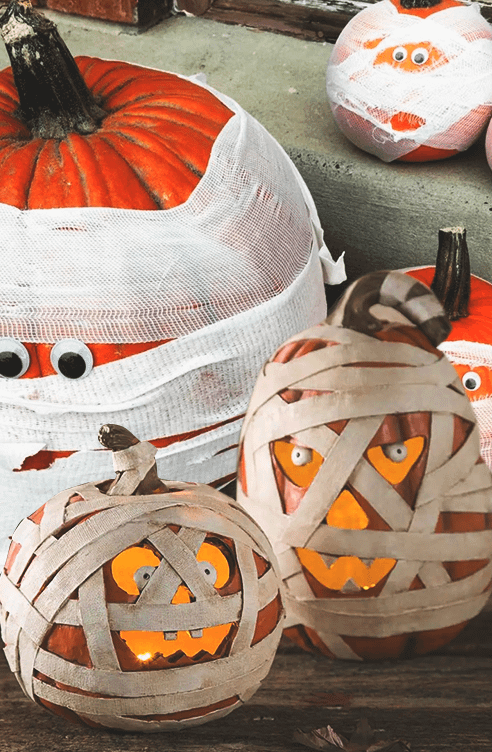 Для быстрого и бюджетного украшения к Хеллоуину нужно несколько упаковок бинтов и при желании пластиковые глазки для игрушек на самоклеющейся основе (если их нет, ничего страшного: можно просто нарисовать маркером). А дальше — в лучших традициях детских игр: заматываем тыкву, приклеиваем глазки, и все готово.