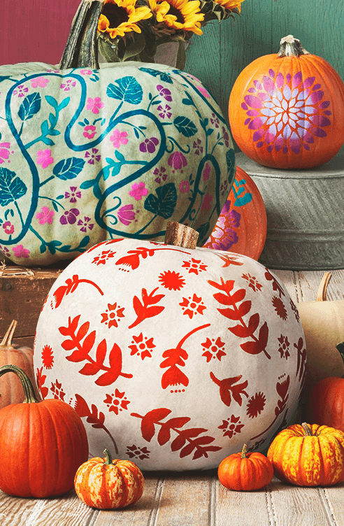 Закрепи трафарет на тыкве с помощью малярного скотча или булавок, а затем заполни рисунок краской из баллончика или кисточкой.