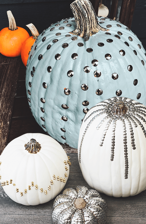 Мебельные заклепки на небольшой тыкве – необычный и интересный способ ее украшения. Их можно сочетать с нежным кружевом – такой контраст будет выглядеть свежо и креативно. Вместо клепок можно взять стразы или полубусины, чтобы сменить «брутальный» образ тыквы на более гламурный, в зависимости от твоего интерьера и пожеланий.