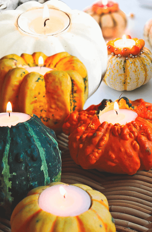 Вырежь у тыквы сердцевину так, чтобы туда плотно входила большая свеча, а затем дополнительно задекорируй овощ на свой вкус. Только теми материалами, что не воспламеняются: можно раскрасить или вырезать что-то, а от лент и кружев на этот раз откажемся. Вставь свечу в отверстие и зажги – воск красиво скатывается по бокам тыквы. Обязательно установи украшение на поднос или тарелку, чтобы не испортить мебель, и наслаждайся атмосферой праздника.