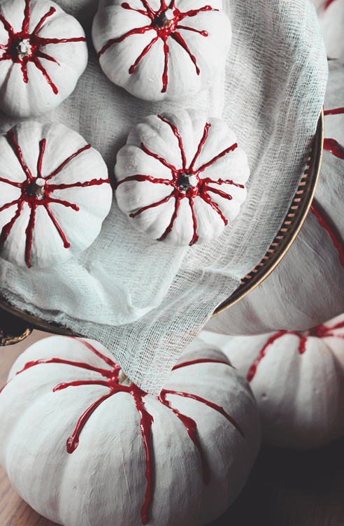 Чтобы получить милый и одновременно жуткий элемент декора, нужно выбрать мини-тыквы и окрасить их в белый цвет. Далее красной краской нарисуй «кровавые» разводы, которые идут от «хвостика» вниз по бокам.