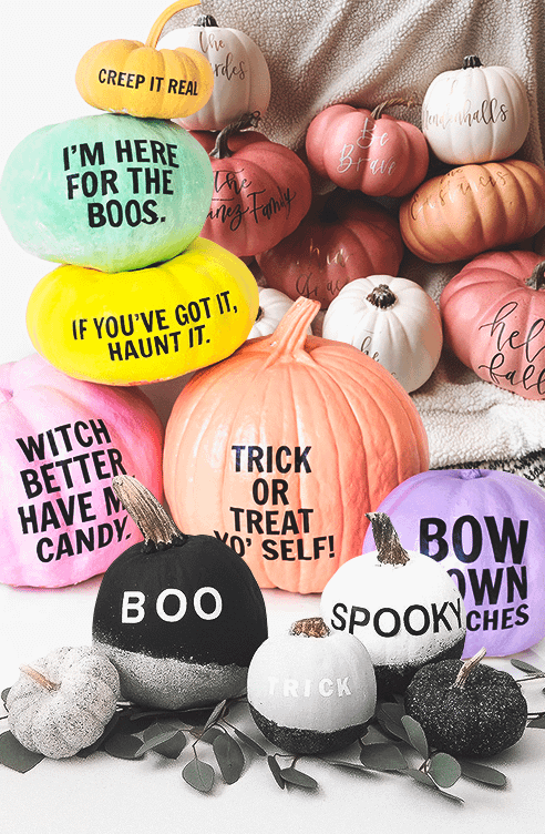 Для того чтобы «вписать» тыкву в интерьер, далекий от тематики Хеллоуина, можно воспользоваться этой идеей. Первое, что нужно будет сделать, – это подобрать подходящий цвет и окрасить тыкву в него полностью (краской из баллончика, например, или кистью, что немного дольше). Дальнейший полет фантазии зависит только от тебя: распечатай шуточные каламбуры или тематические поздравления, приклей или обведи их маркером, а затем закрась внутри. Если планируется большая вечеринка, такие тыквы, украшенные именами друзей, подойдут как маркеры для рассадки гостей.
