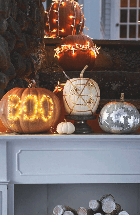На тыкве «с посланием» можно написать как стандартное «BOO!», так и что-то еще, главное — чтобы надпись поместилась. Далее придется запастись терпением и булавками: тебе нужно воткнуть их примерно на 2/3 длины. Затем возьми светодиодную беспроводную гирлянду и оберни ею каждую булавку. При желании можно повторить процедуру 2–3 раза. Аккумулятор спрячь внутри тыквы. Если беспроводной гирлянды нет – то размести тыкву на полке рядом с розеткой и спрячь провод.