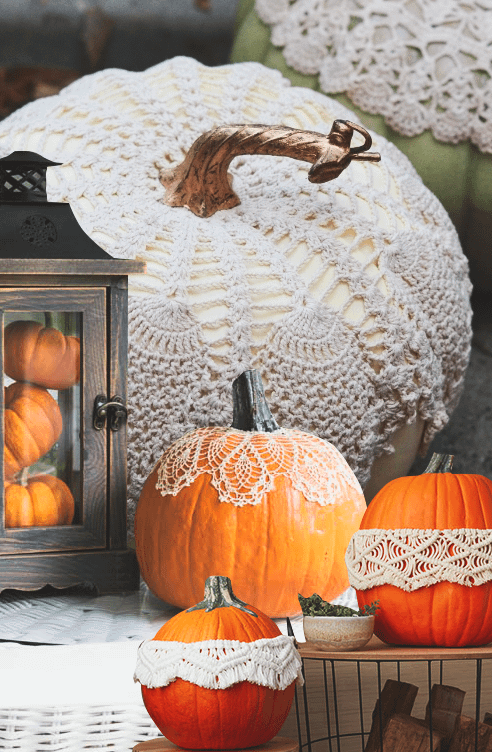 Если у тебя под рукой есть моток черных ниток, а также навыки вязания крючком простых салфеток по кругу, увлечение пригодится и на Хеллоуин. Винтажная атмосфера, присущая таким элементам декора, придется как нельзя кстати. Свяжи салфетку и накинь ее на тыкву сверху или накрахмаль и придай ей форму салатника, куда можно положить оранжевый овощ.