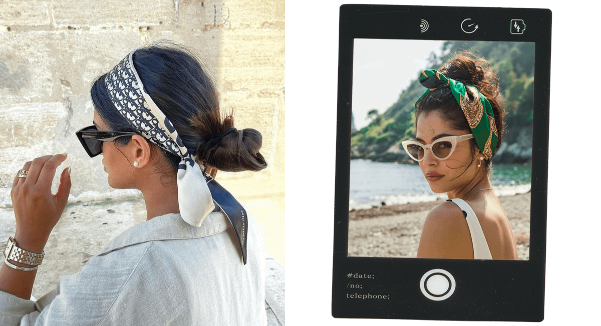 Собери волосы в низкий пучок или хвост на затылке. Затем возьми квадратный платок и сложи его по диагонали в полосу. Оберни платок вокруг головы, а концы завяжи под пучком или оставь их свободными. Пряди у лица можешь оставить свободными или закрутить в мелкие локоны.