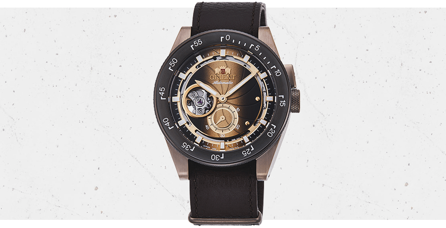 14. ORIENT RA-AR0204G с циферблатом шоколадного цвета из минерального стекла и водозащитой 5 АТМ.