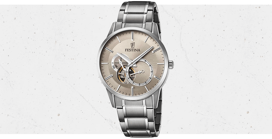 15. FESTINA F6845/2 из Гонконга в стиле «Скелетон» с открытым на циферблате механизмом и полностью стальным корпусом.
