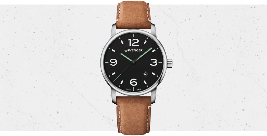 2. WENGER 01.1741.117 с циферблатом из минерального стекла с сапфировым напылением и браслетом из натуральной кожи.