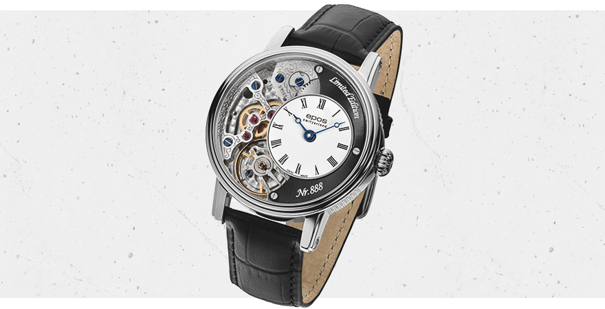 12. EPOS 3435.313.20.25.25 из Швейцарии с открытым механизмом в корпусе из стали и натуральной кожи.
