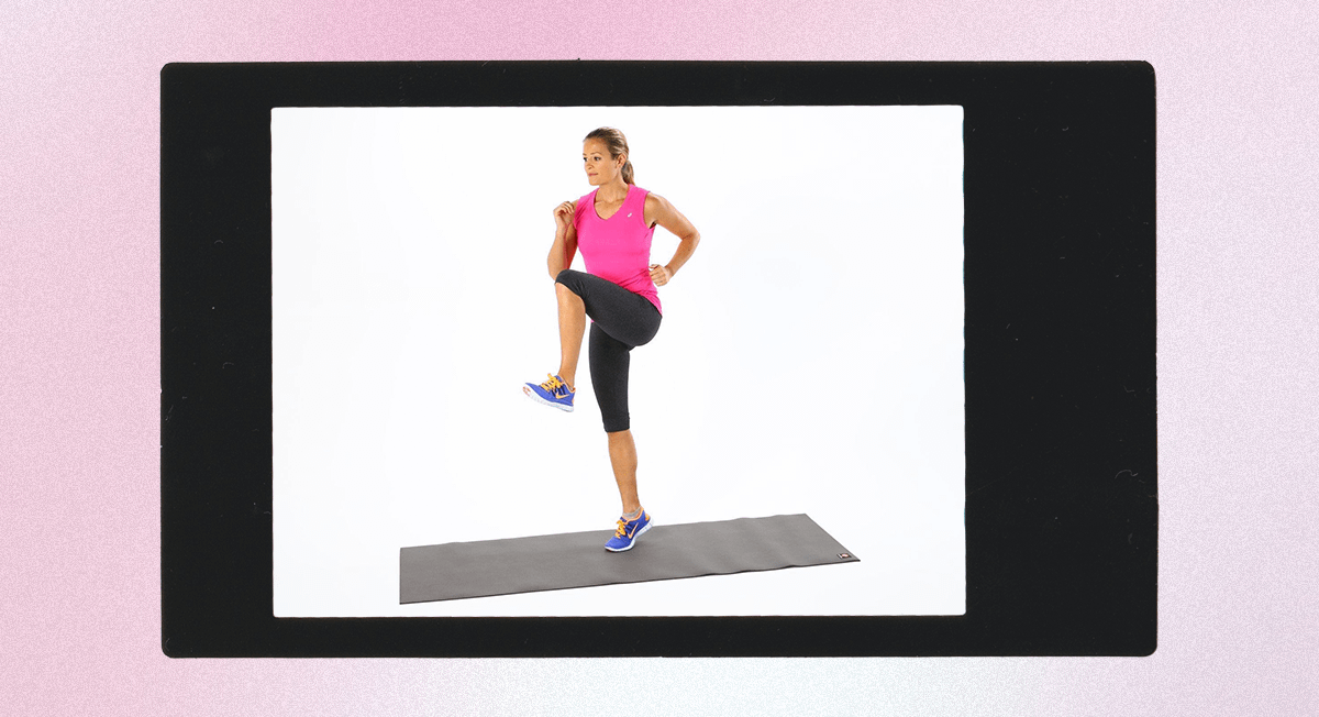 - начни бежать на месте, поднимая колени как можно выше — лучше до уровня талии;