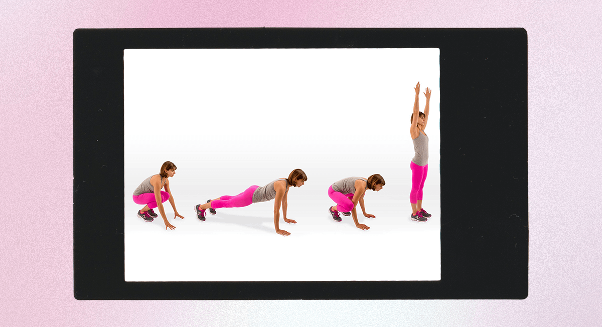 Это упражнение отлично разгоняет пульс, задействует сразу несколько групп мышц и помогает активно сжигать жир.