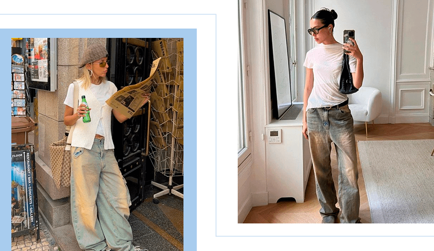 Появление этого модного тренда тоже связано с ностальгией по эстетике нулевых. Современные модницы выбирают широкие «грязные» или «ржавые» джинсы. Модели с низкой посадкой можно дополнить массивным ремнем, майкой-алкоголичкой или кожаной курткой в том же винтажном стиле.