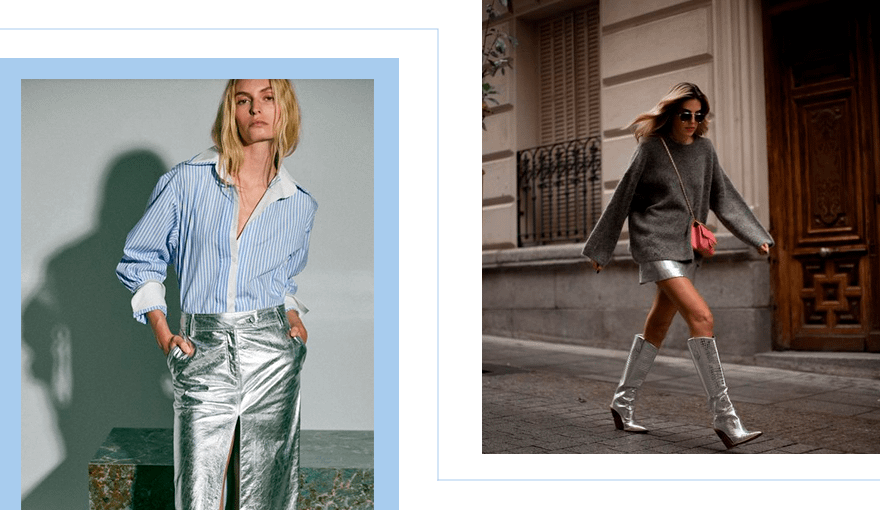 Лучший всего металлик сочетается с базовым серым и черными цветами. Но ты можешь поэкспериментировать. Например, смешать в одном образе металлик, желтый и ярко-синий оттенки.