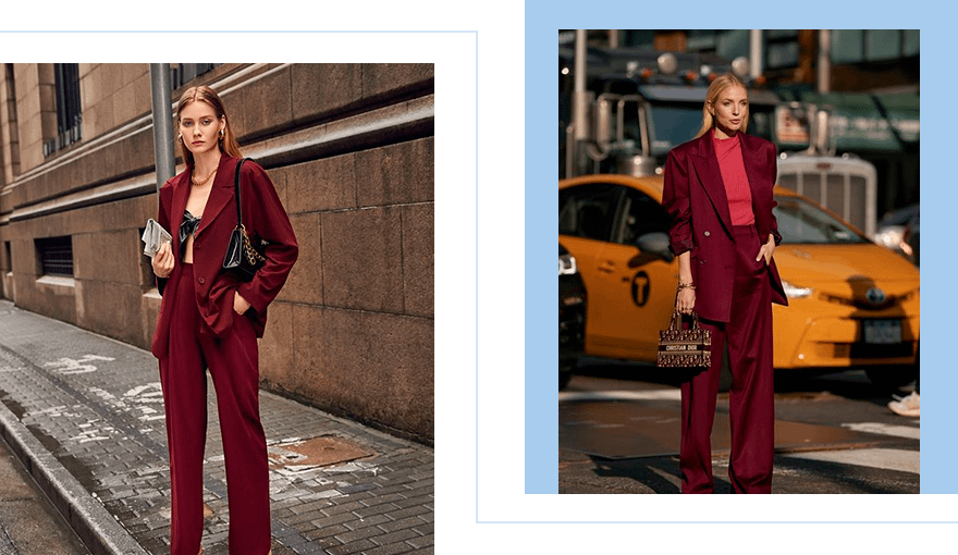 Если хочешь выделить свою увлеченность модными трендами, создай монохромный бордовый образ. Это может быть брючный костюм, платье в сочетании с пальто или более спортивный лук. Ориентируйся на свои предпочтения и уместность одежды.