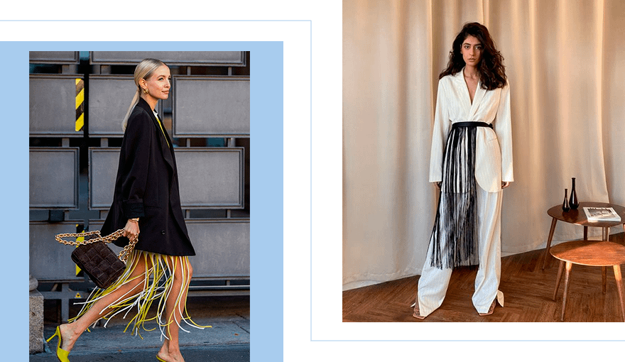 Предпочитаешь минималистичный стиль? Присмотрись к украшениям из бахромы, имитирующим полупрозрачные юбки. Такую вещь можно надеть поверх базового брючного костюма или платья.