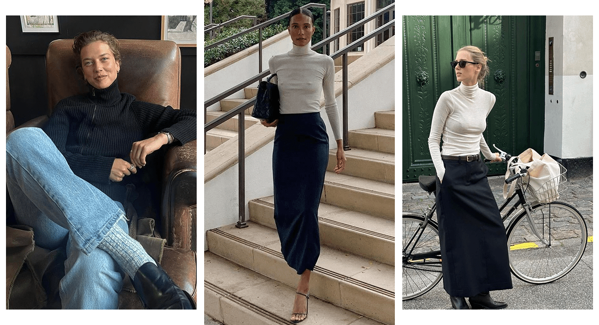 В твоем осенне-зимнем гардеробе также должна появиться водолазка в базовом цвете. Ее легко вписать в образ как с брючным костюмом, так и с юбкой миди или мини. Если есть возможность, купи сразу две водолазки: одну облегающую, вторую — свободного кроя.