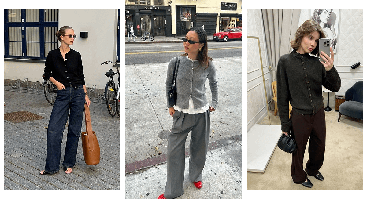 Несмотря на то, что многие девушки осенью выбирают одежду оверсайз-кроя, стилисты рекомендуют не отказываться от возможности носить трикотажные кардиганы на пуговицах. Они отсылают к эстетике нулевых, при этом выглядят сдержанно и стильно. Самые простые для стилизации — модели в черном, сером и темно-синем цветах.
